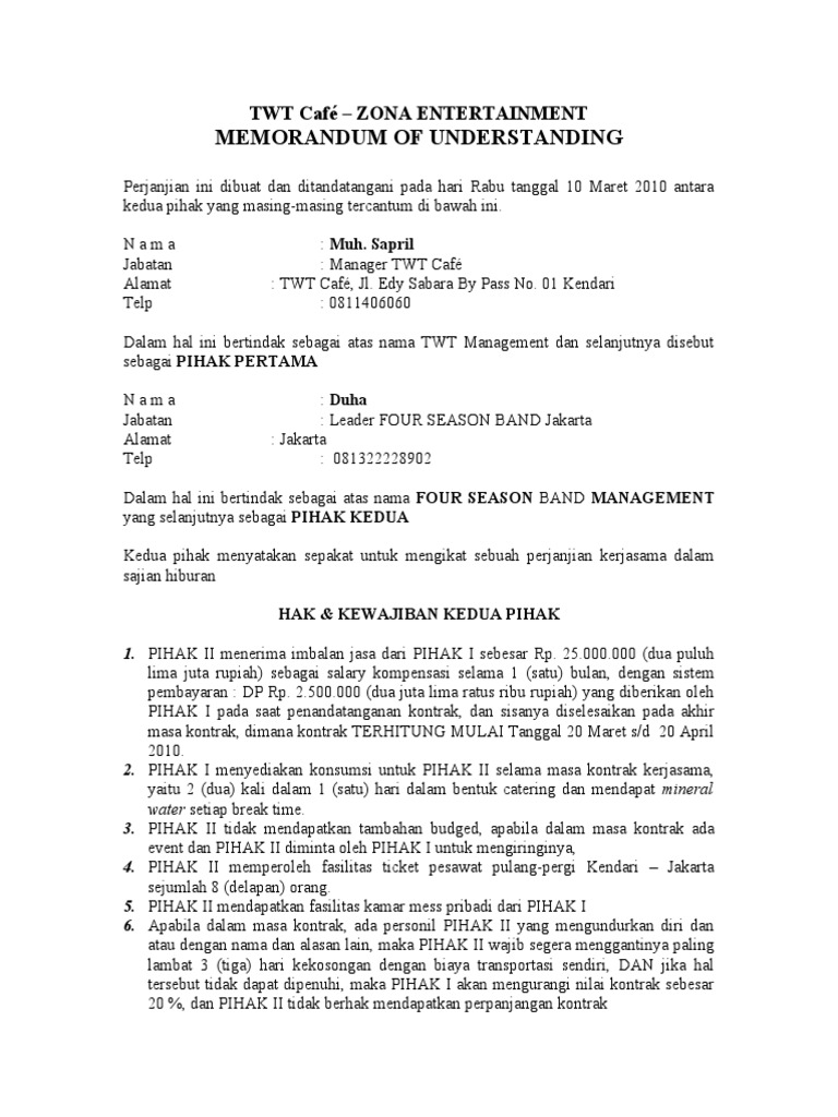 PIHAK PERTAMA wajib menjaga ketertiban dan disiplin kelompok musiknya dalam segala hal yang berkaitan dengan acara pertunjukan musik sebagaimana tersebut dalam pasal 1 selama. Contoh Surat Perjanjian Kerja Karyawan Part Time. Untuk itu sebelum melihat bagaimana contoh surat perjanjian kerjasama maka kamu harus pahami terkiat dengan syarat sah surat tersebut.